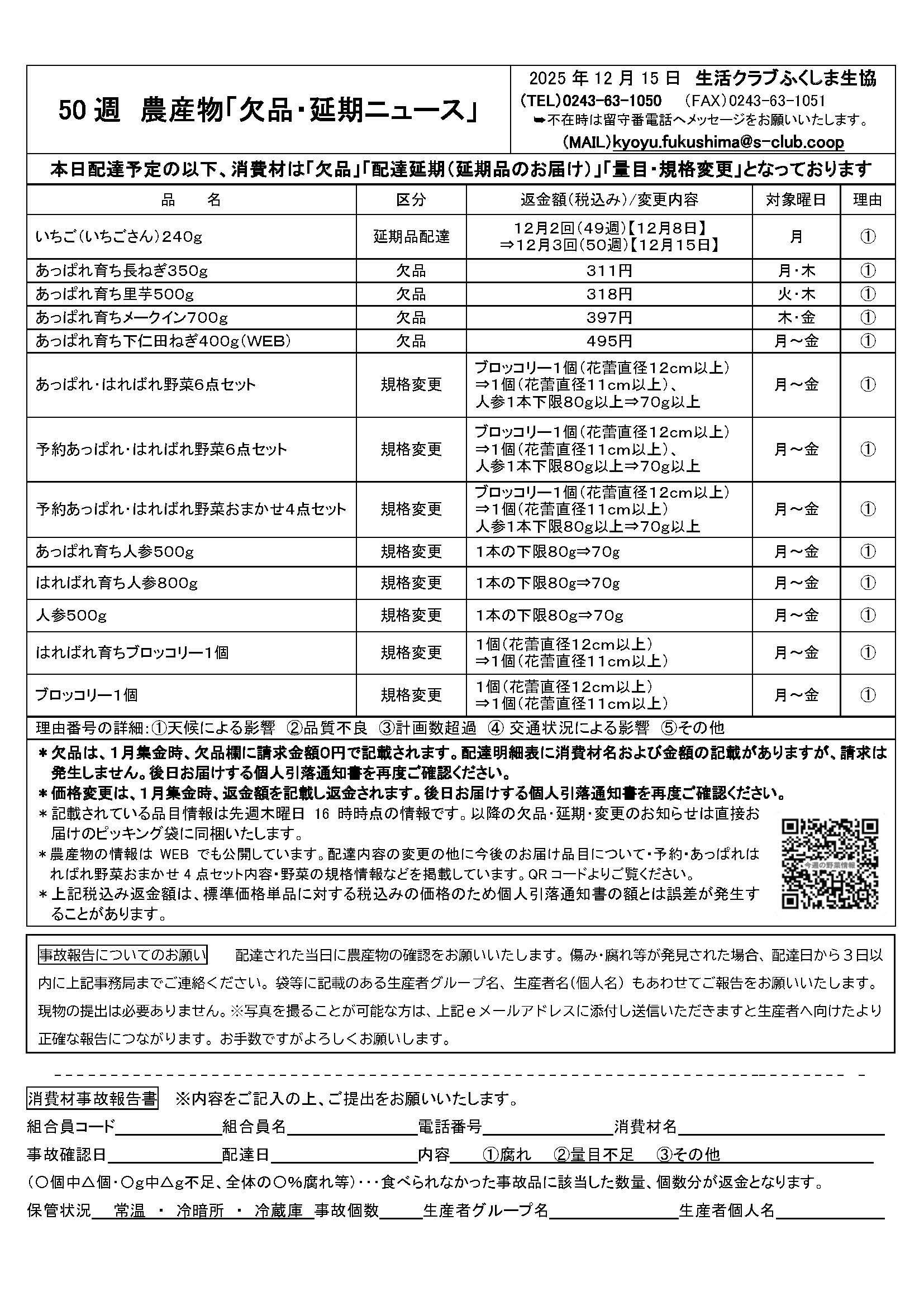 【組合員の皆様へ】50週(12/15~12/19)の配達ニュース