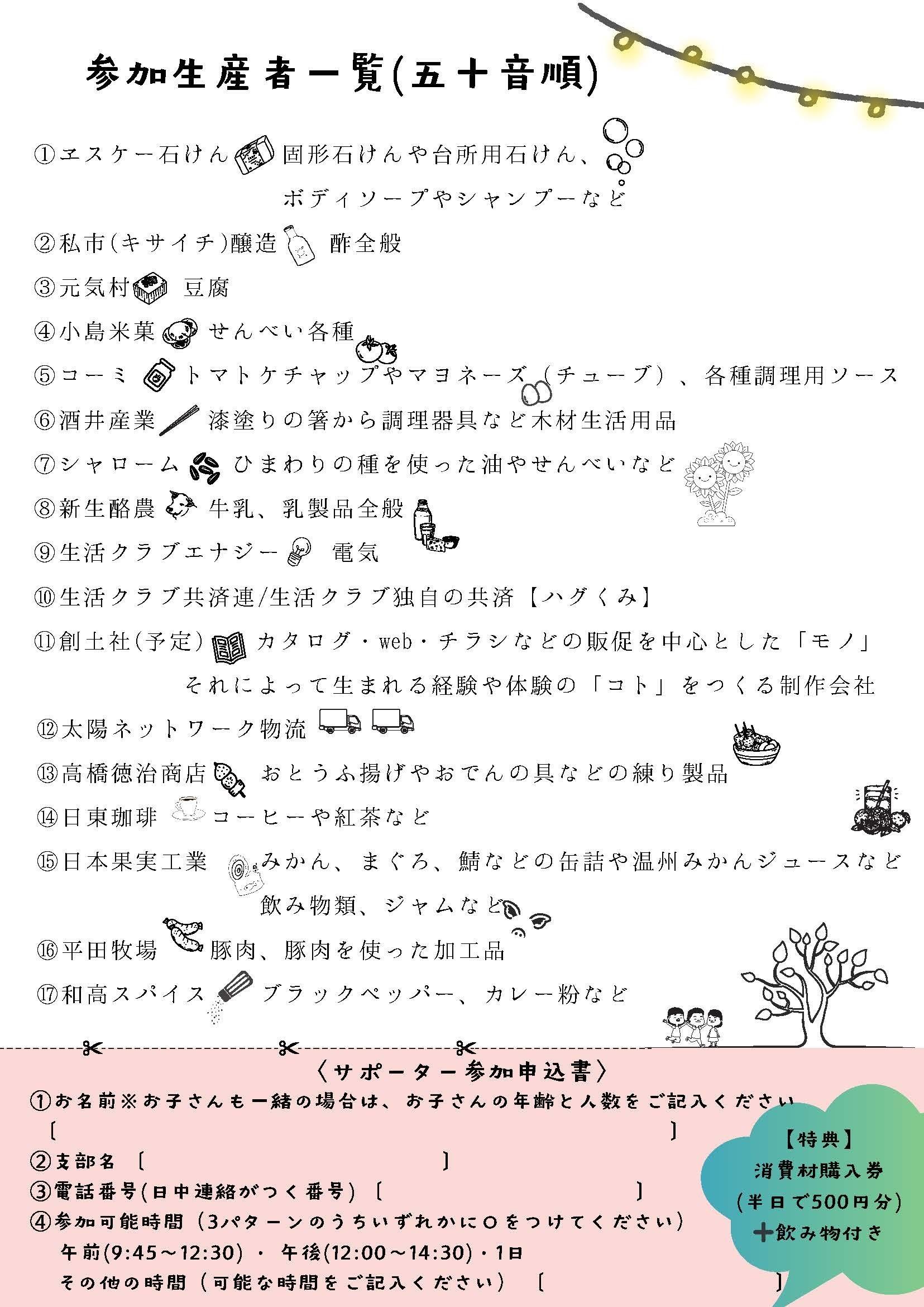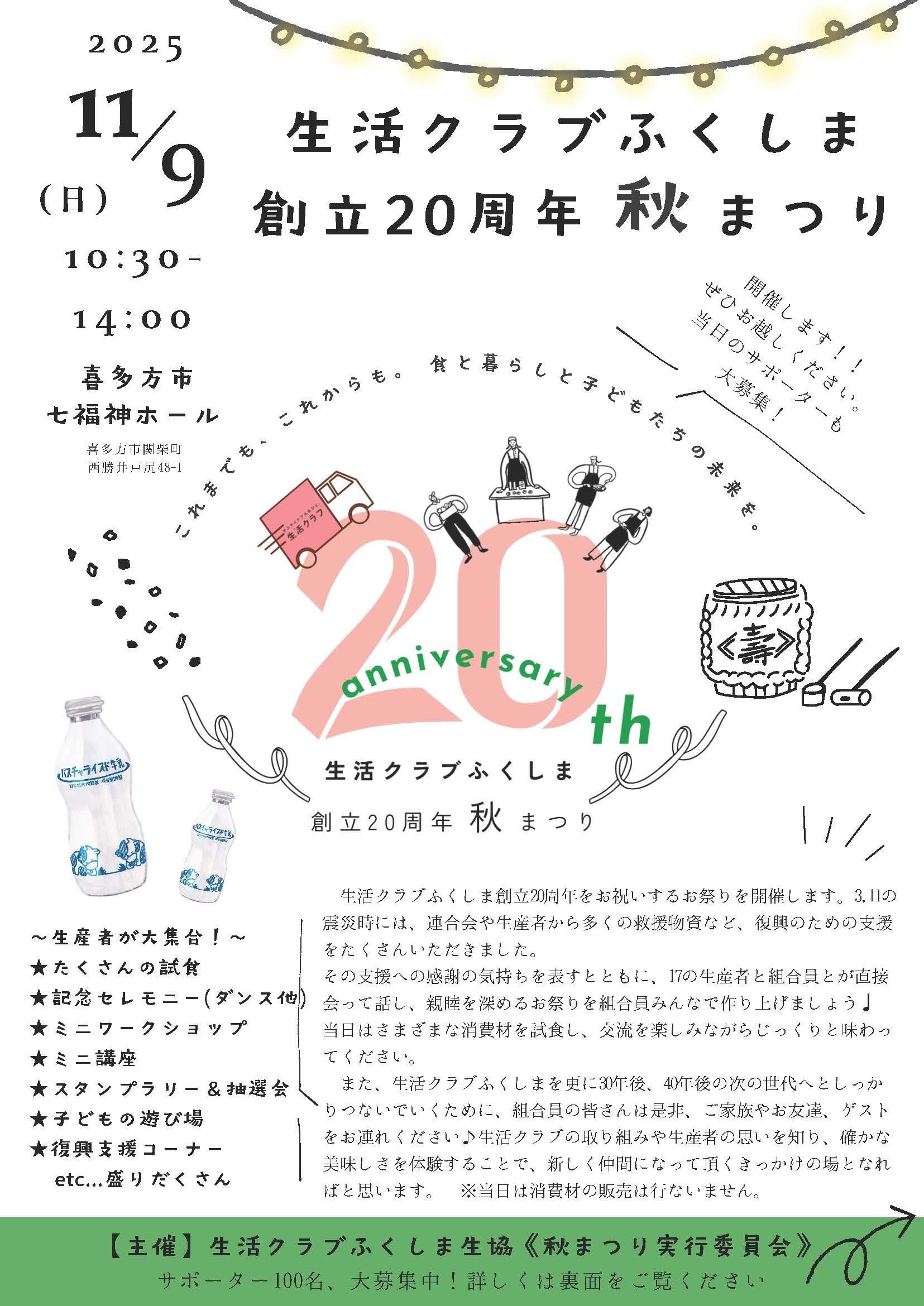 【11/9㈰開催】「生活クラブふくしま 創立20周年秋まつり」サポーター募集 Tweet 「サポーター参加申込み」ご協力いただける方はこちらのボタンからも申込可能です。イベント名の欄へ参加可能な時間もご入力お願いいたします。