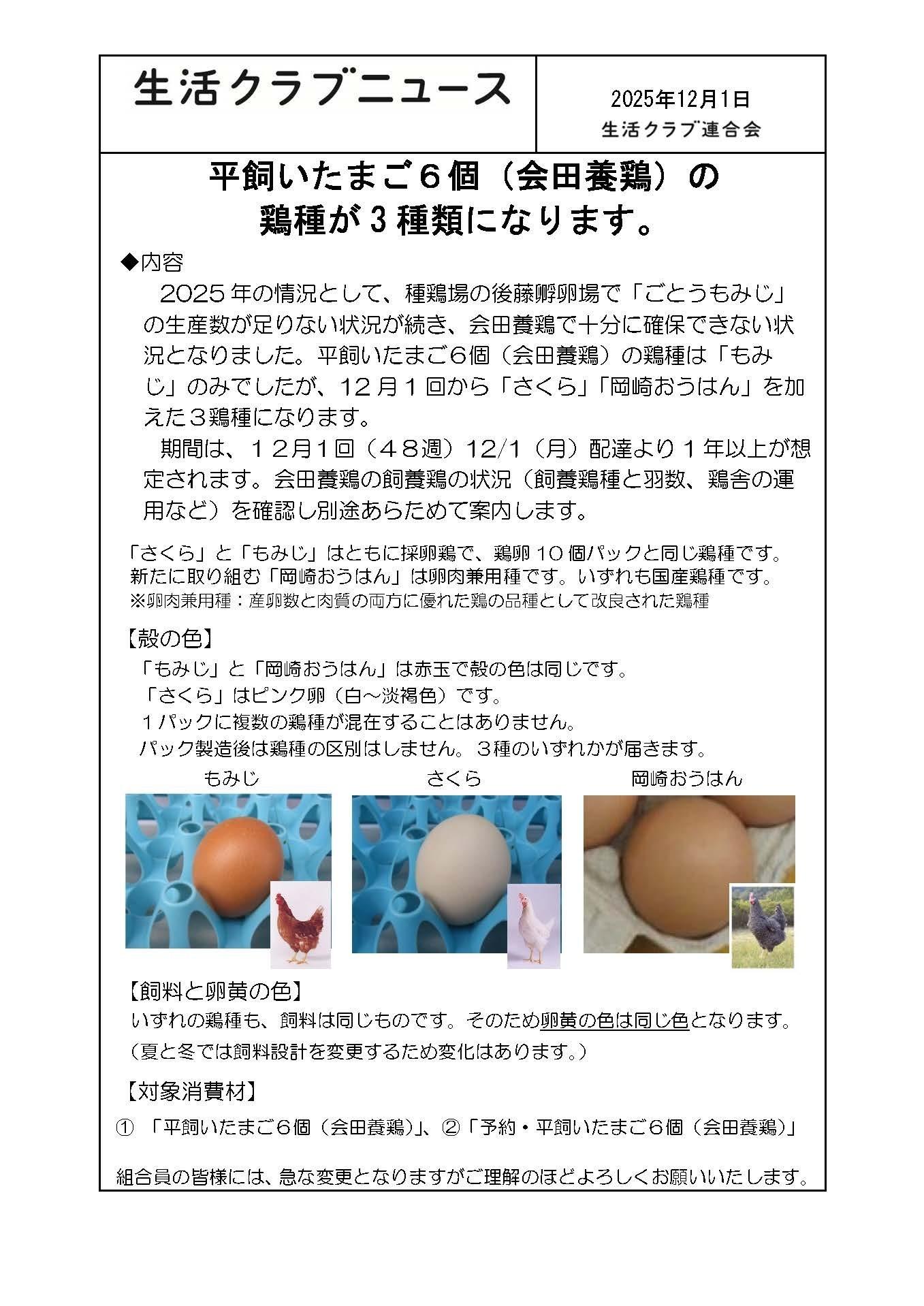 【組合員の皆様へ】平飼いたまご6個(会田養鶏)の鶏種が3種類になります。