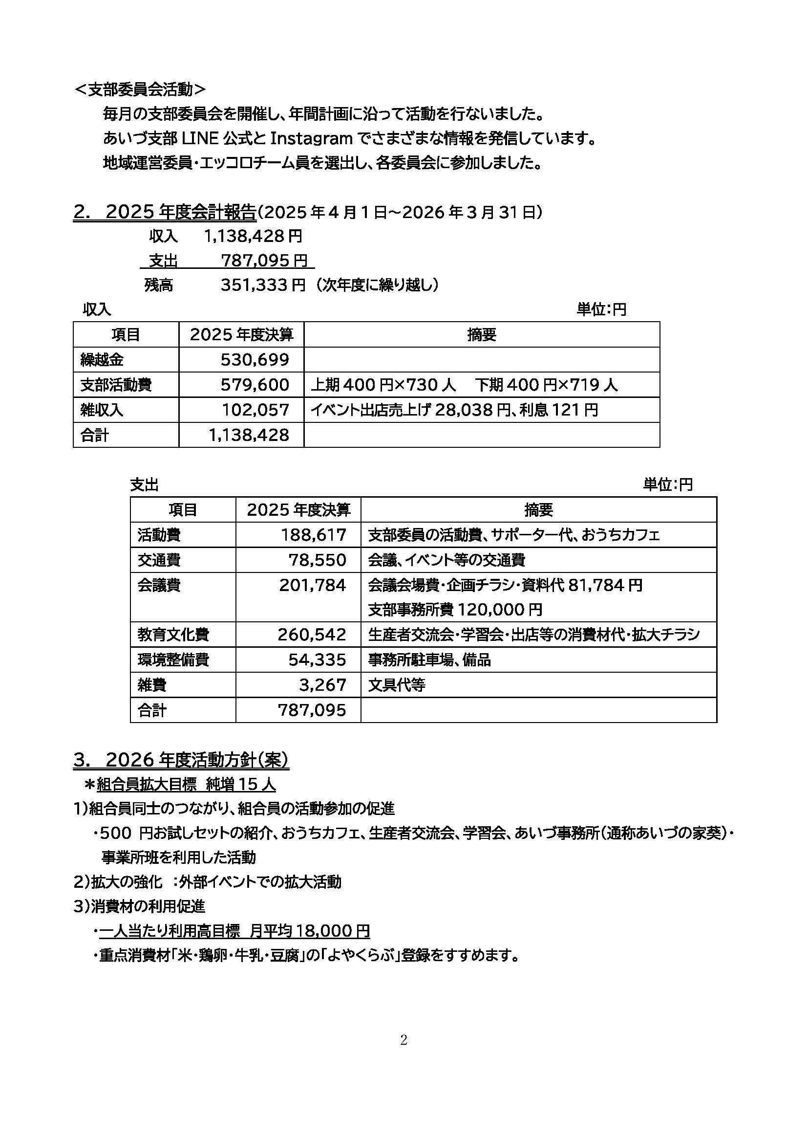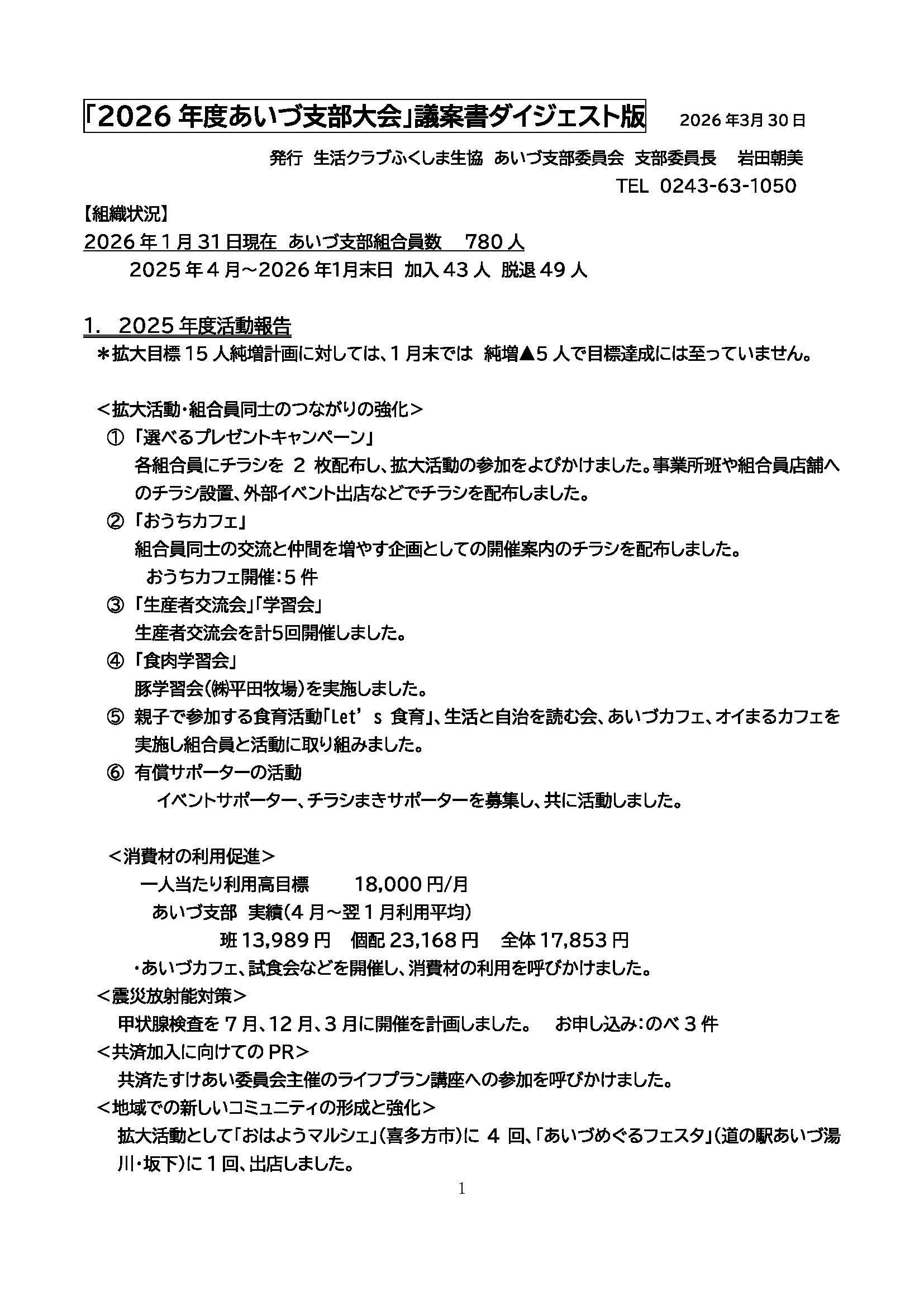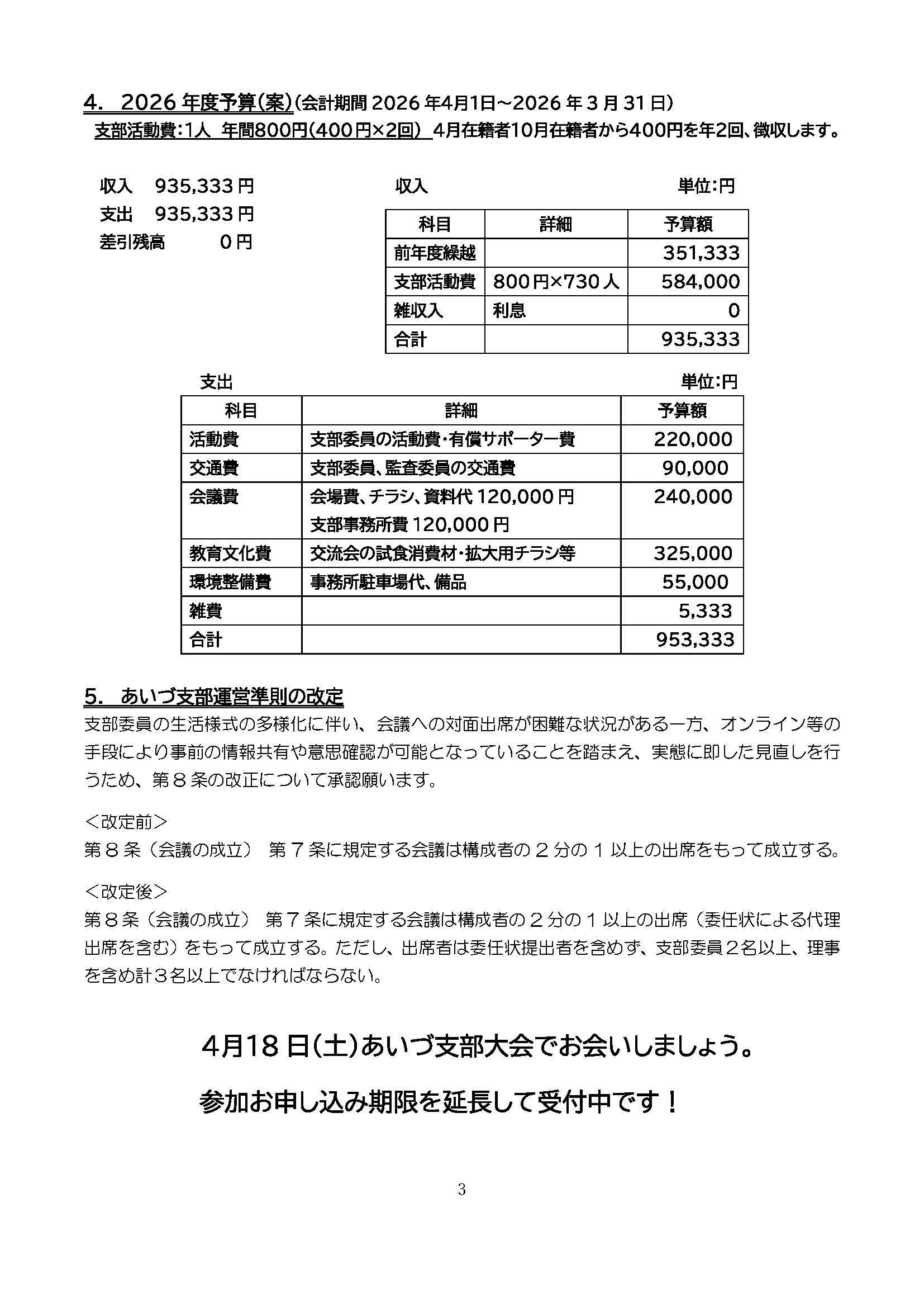 【あいづ支部組合員の皆様へ】「2026年度あいづ支部大会」議案書ダイジェスト版 の配布 Tweet 13週(3/30~4/3)に画像の内容が配布されますので、ご確認をお願いいたします。 4/18(土)の支部大会へのご参加もお待ちしております。
